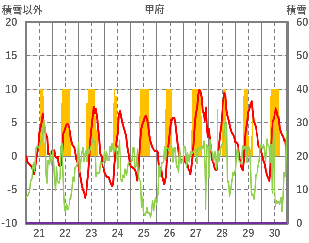 | 日 | 時 | 気温 | 降水 | 風向/風速 | 日照 | 積雪 | 降雪 |