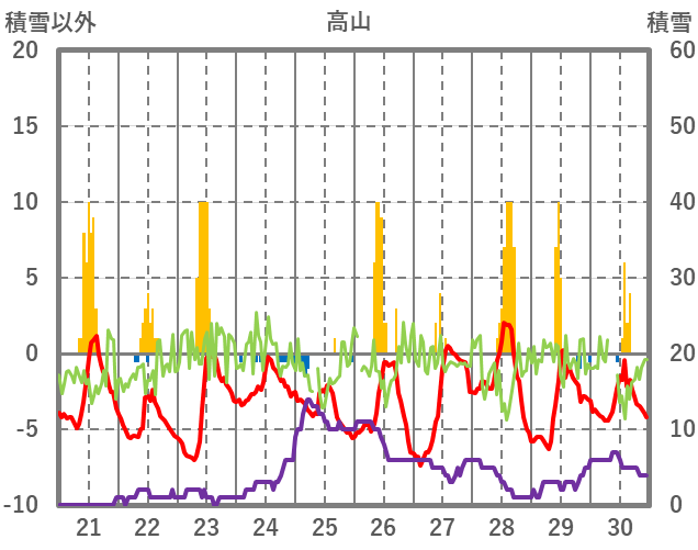 | 日 | 時 | 気温 | 降水 | 風向/風速 | 日照 | 積雪 | 降雪 |