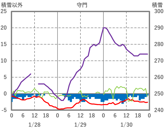 | 日 | 時 | 気温 | 降水 | 風向/風速 | 日照 | 積雪 | 降雪 |