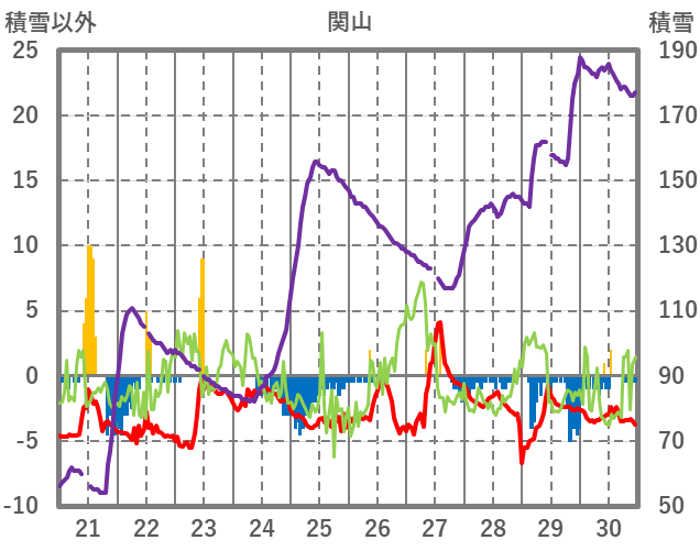 | 日 | 時 | 気温 | 降水 | 風向/風速 | 日照 | 積雪 | 降雪 |