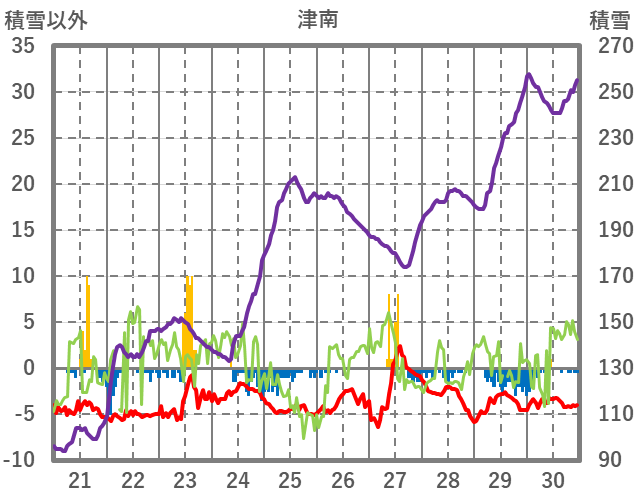| 日 | 時 | 気温 | 降水 | 風向/風速 | 日照 | 積雪 | 降雪 |