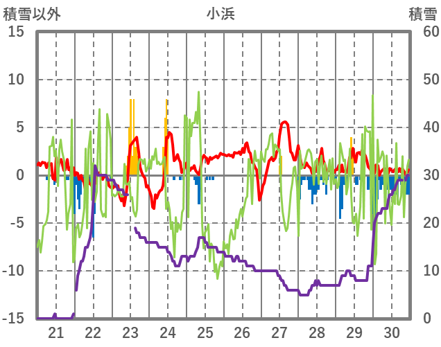 | 日 | 時 | 気温 | 降水 | 風向/風速 | 日照 | 積雪 | 降雪 |