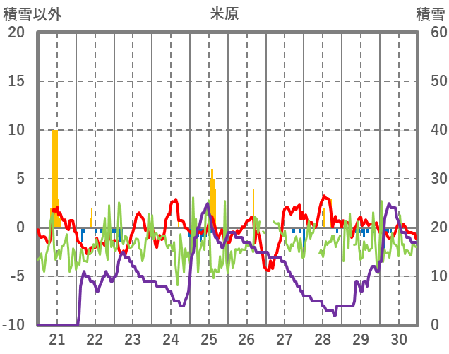 | 日 | 時 | 気温 | 降水 | 風向/風速 | 日照 | 積雪 | 降雪 |