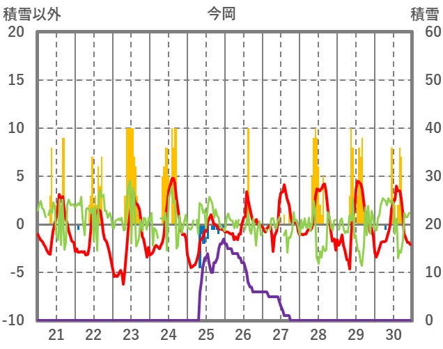 | 日 | 時 | 気温 | 降水 | 風向/風速 | 日照 | 積雪 | 降雪 |