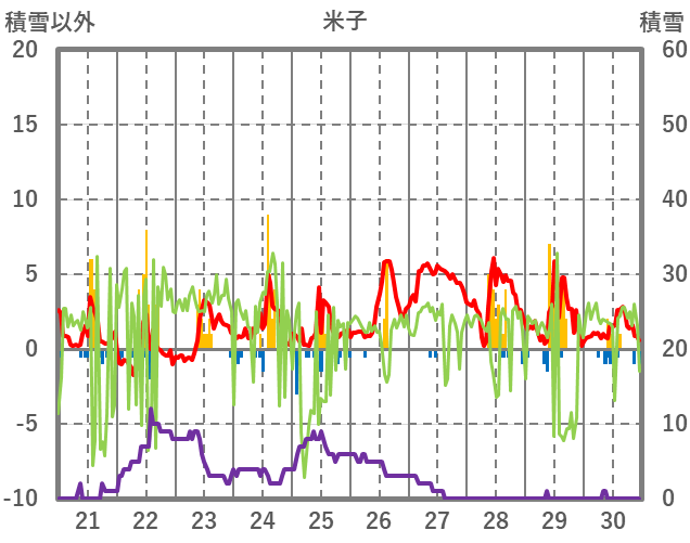 | 日 | 時 | 気温 | 降水 | 風向/風速 | 日照 | 積雪 | 降雪 |