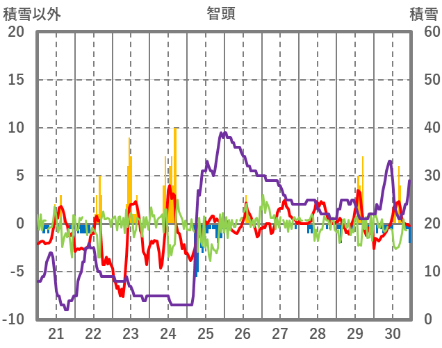 | 日 | 時 | 気温 | 降水 | 風向/風速 | 日照 | 積雪 | 降雪 |