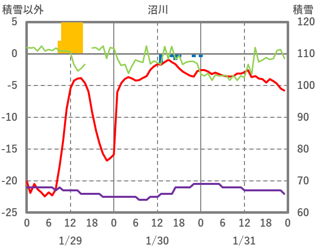 | 日 | 時 | 気温 | 降水 | 風向/風速 | 日照 | 積雪 | 降雪 |