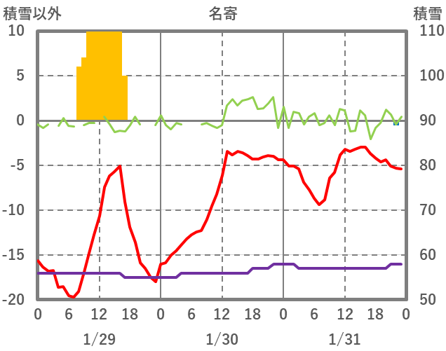 | 日 | 時 | 気温 | 降水 | 風向/風速 | 日照 | 積雪 | 降雪 |