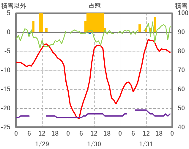 | 日 | 時 | 気温 | 降水 | 風向/風速 | 日照 | 積雪 | 降雪 |