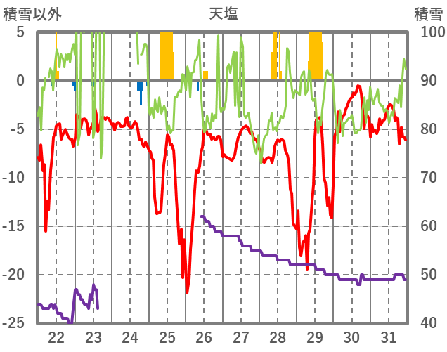 | 日 | 時 | 気温 | 降水 | 風向/風速 | 日照 | 積雪 | 降雪 |