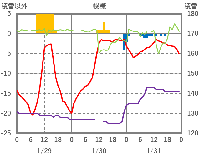 | 日 | 時 | 気温 | 降水 | 風向/風速 | 日照 | 積雪 | 降雪 |