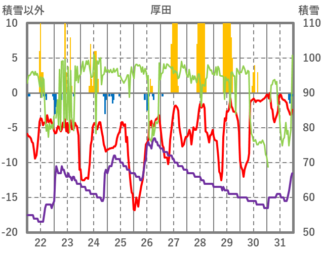 | 日 | 時 | 気温 | 降水 | 風向/風速 | 日照 | 積雪 | 降雪 |