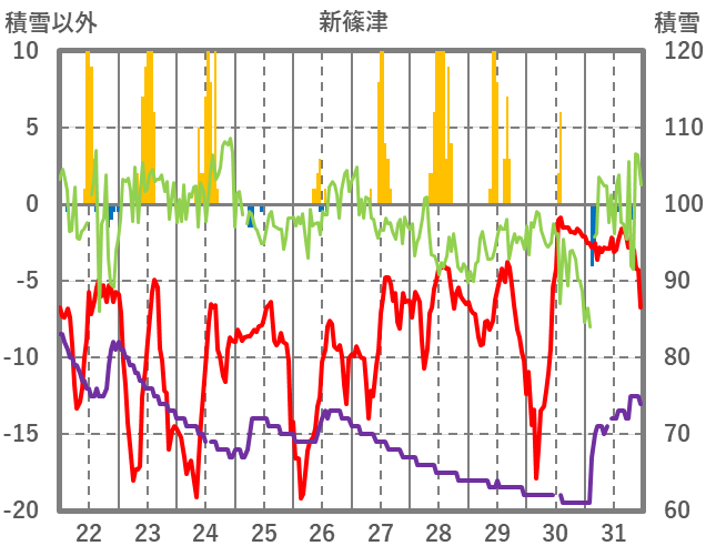 | 日 | 時 | 気温 | 降水 | 風向/風速 | 日照 | 積雪 | 降雪 |