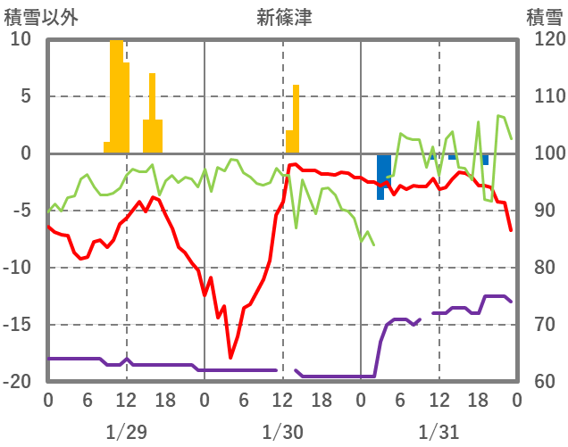 | 日 | 時 | 気温 | 降水 | 風向/風速 | 日照 | 積雪 | 降雪 |