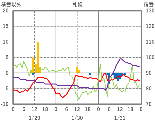 | 日 | 時 | 気温 | 降水 | 風向/風速 | 日照 | 積雪 | 降雪 |