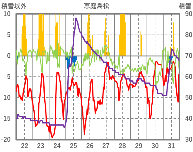 | 日 | 時 | 気温 | 降水 | 風向/風速 | 日照 | 積雪 | 降雪 |