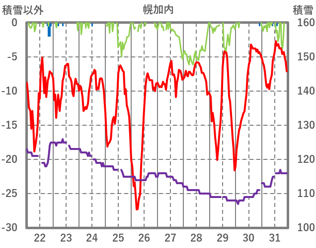 | 日 | 時 | 気温 | 降水 | 風向/風速 | 日照 | 積雪 | 降雪 |