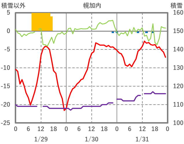 | 日 | 時 | 気温 | 降水 | 風向/風速 | 日照 | 積雪 | 降雪 |