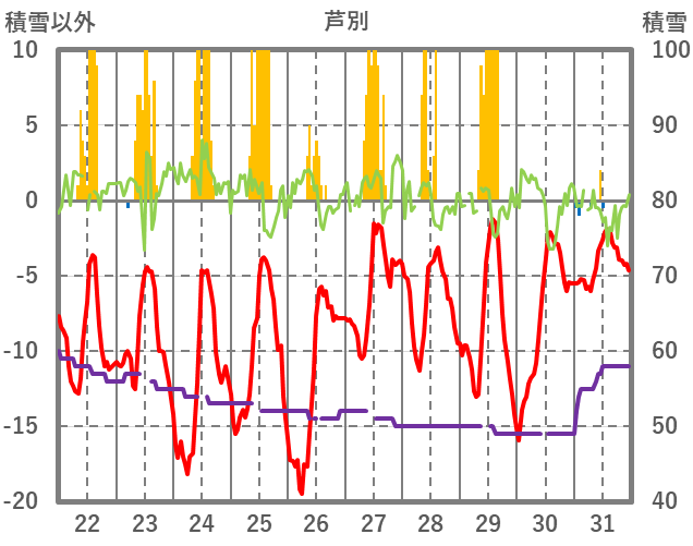 | 日 | 時 | 気温 | 降水 | 風向/風速 | 日照 | 積雪 | 降雪 |