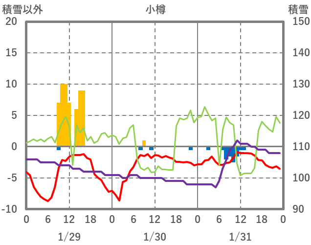 | 日 | 時 | 気温 | 降水 | 風向/風速 | 日照 | 積雪 | 降雪 |