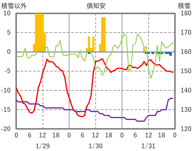 | 日 | 時 | 気温 | 降水 | 風向/風速 | 日照 | 積雪 | 降雪 |