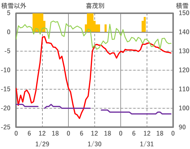 | 日 | 時 | 気温 | 降水 | 風向/風速 | 日照 | 積雪 | 降雪 |