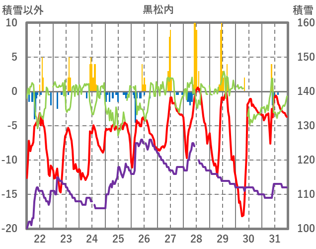 | 日 | 時 | 気温 | 降水 | 風向/風速 | 日照 | 積雪 | 降雪 |