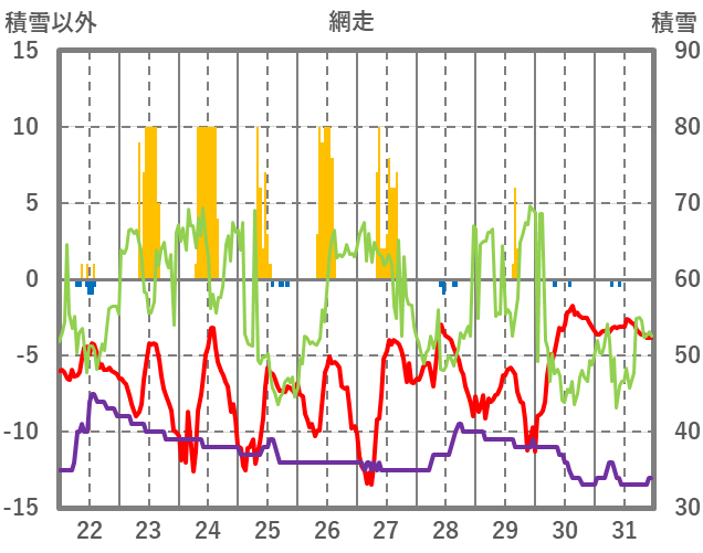 | 日 | 時 | 気温 | 降水 | 風向/風速 | 日照 | 積雪 | 降雪 |