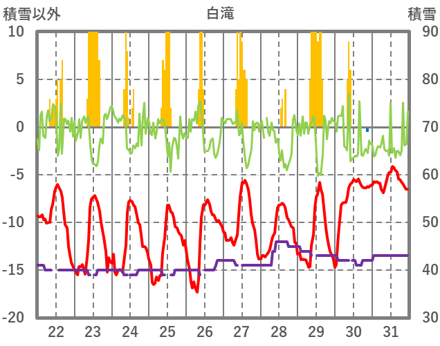 | 日 | 時 | 気温 | 降水 | 風向/風速 | 日照 | 積雪 | 降雪 |