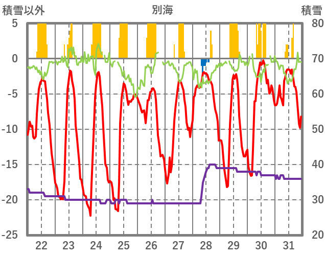 | 日 | 時 | 気温 | 降水 | 風向/風速 | 日照 | 積雪 | 降雪 |