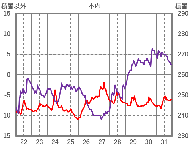| 日 | 時 | 気温 | 降水 | 風向/風速 | 日照 | 積雪 | 降雪 |