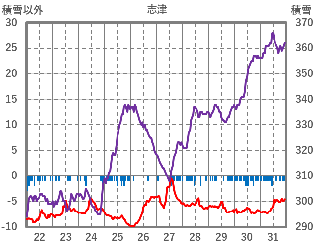 | 日 | 時 | 気温 | 降水 | 風向/風速 | 日照 | 積雪 | 降雪 |