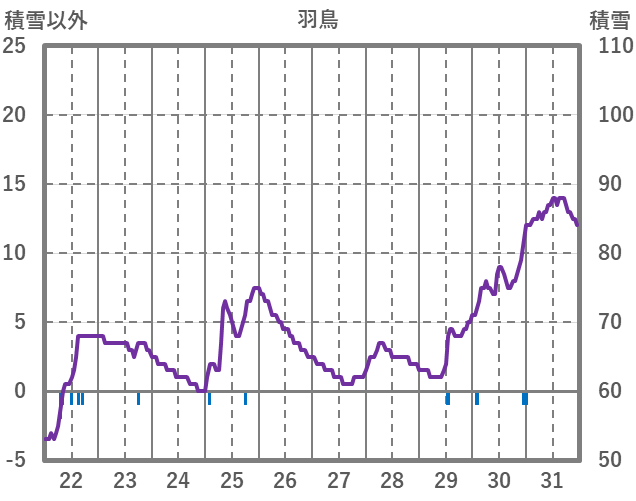 | 日 | 時 | 気温 | 降水 | 風向/風速 | 日照 | 積雪 | 降雪 |