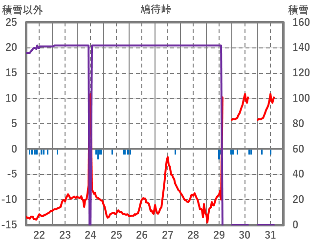 | 日 | 時 | 気温 | 降水 | 風向/風速 | 日照 | 積雪 | 降雪 |