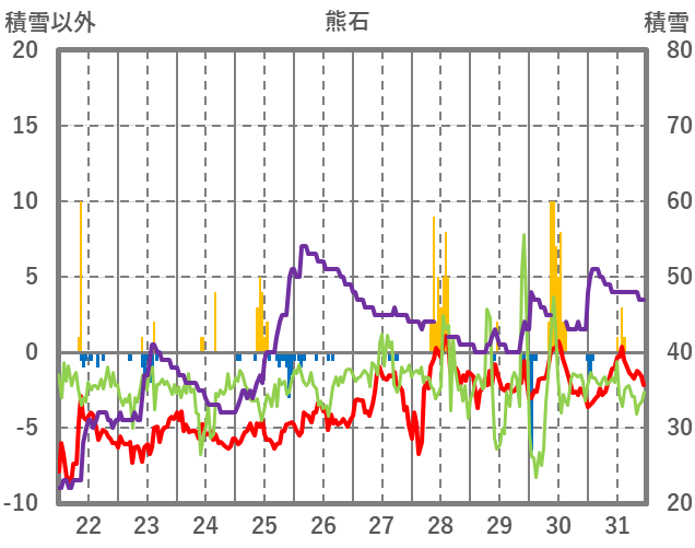 | 日 | 時 | 気温 | 降水 | 風向/風速 | 日照 | 積雪 | 降雪 |