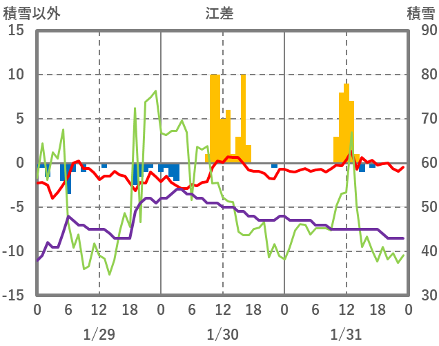 | 日 | 時 | 気温 | 降水 | 風向/風速 | 日照 | 積雪 | 降雪 |