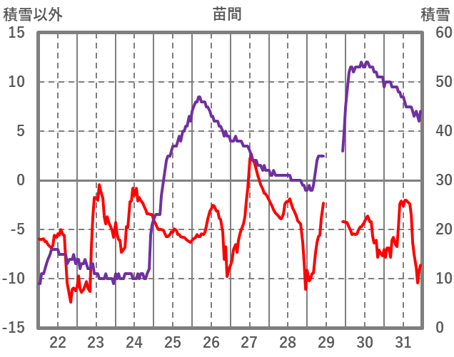 | 日 | 時 | 気温 | 降水 | 風向/風速 | 日照 | 積雪 | 降雪 |