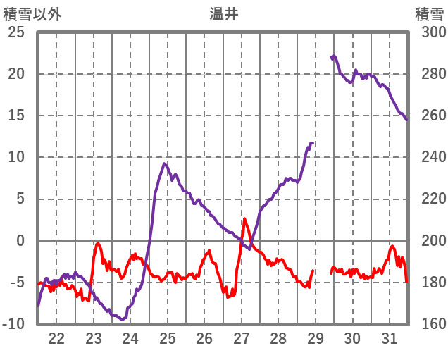 | 日 | 時 | 気温 | 降水 | 風向/風速 | 日照 | 積雪 | 降雪 |
