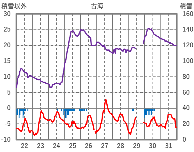 | 日 | 時 | 気温 | 降水 | 風向/風速 | 日照 | 積雪 | 降雪 |