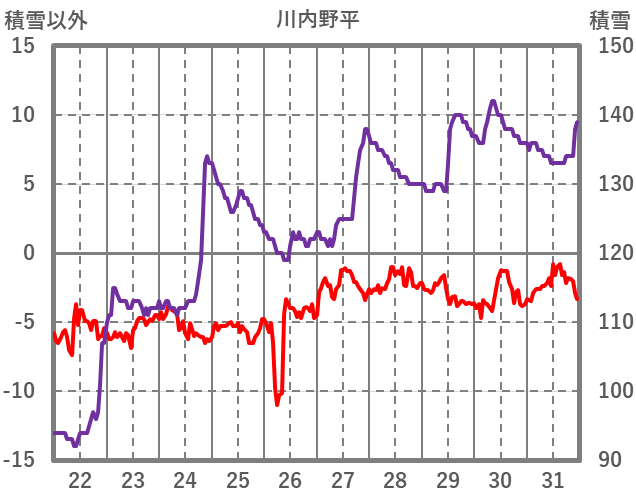 | 日 | 時 | 気温 | 降水 | 風向/風速 | 日照 | 積雪 | 降雪 |