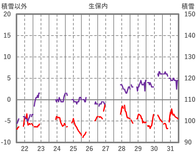 | 日 | 時 | 気温 | 降水 | 風向/風速 | 日照 | 積雪 | 降雪 |