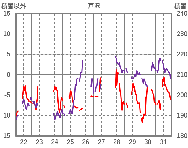 | 日 | 時 | 気温 | 降水 | 風向/風速 | 日照 | 積雪 | 降雪 |