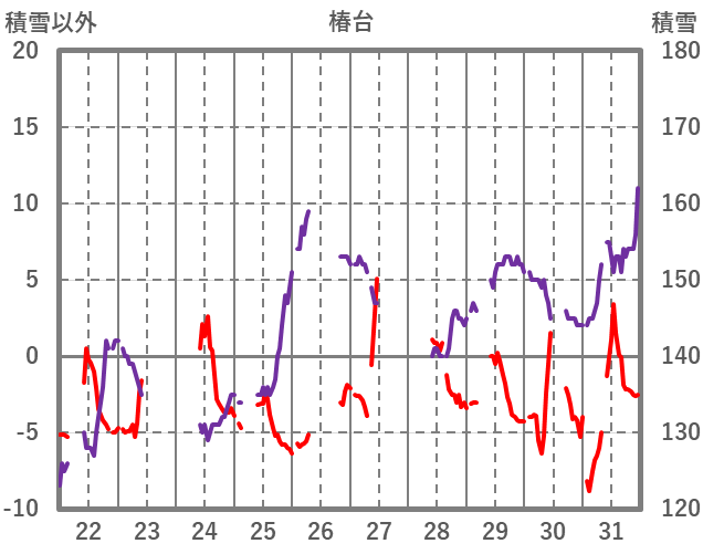 | 日 | 時 | 気温 | 降水 | 風向/風速 | 日照 | 積雪 | 降雪 |