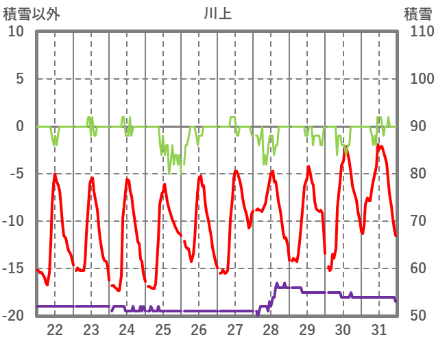 | 日 | 時 | 気温 | 降水 | 風向/風速 | 日照 | 積雪 | 降雪 |