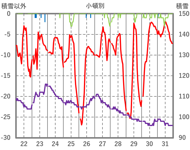 | 日 | 時 | 気温 | 降水 | 風向/風速 | 日照 | 積雪 | 降雪 |