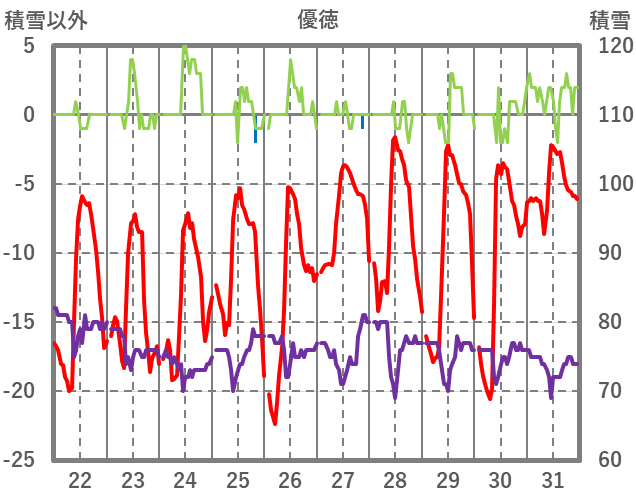 | 日 | 時 | 気温 | 降水 | 風向/風速 | 日照 | 積雪 | 降雪 |