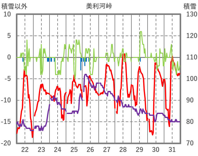 | 日 | 時 | 気温 | 降水 | 風向/風速 | 日照 | 積雪 | 降雪 |