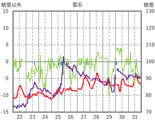 | 日 | 時 | 気温 | 降水 | 風向/風速 | 日照 | 積雪 | 降雪 |