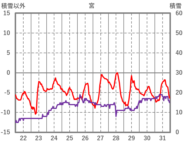 | 日 | 時 | 気温 | 降水 | 風向/風速 | 日照 | 積雪 | 降雪 |