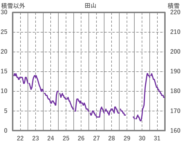 | 日 | 時 | 気温 | 降水 | 風向/風速 | 日照 | 積雪 | 降雪 |